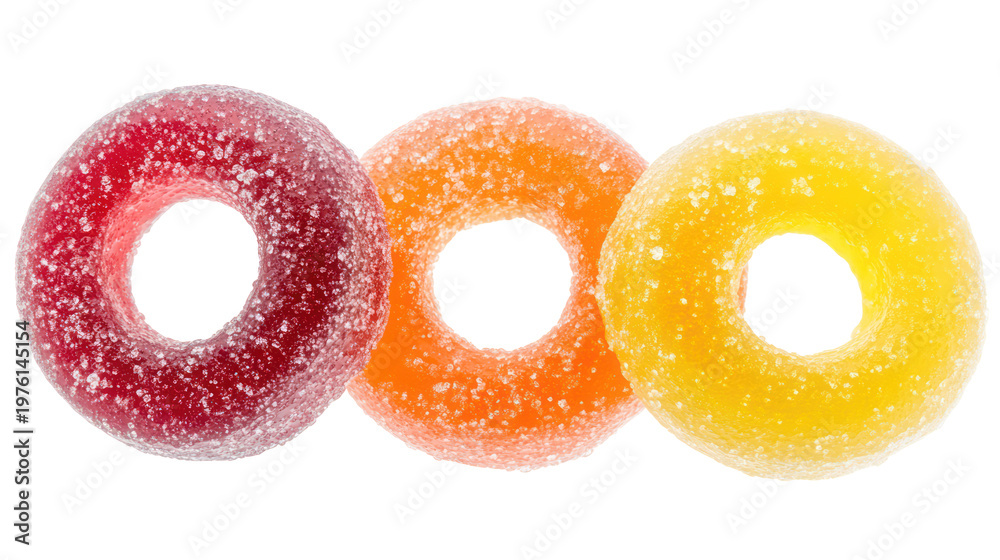 Colorful, sugared, jelly rings, resembling donuts
