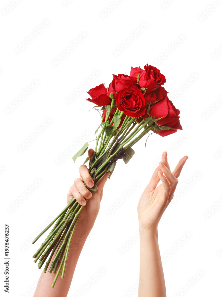 Female Hands With Beautiful Red Rose Flowers On Wallpaper Mural - Decorly Solutions | Decorly Solutions