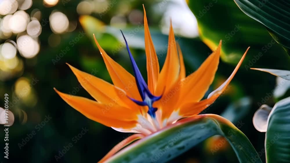 In a lush tropical garden a striking orange bird of paradise flower puts on a vibrant display. The flower stands out among green foliage capturing the essence of paradise.