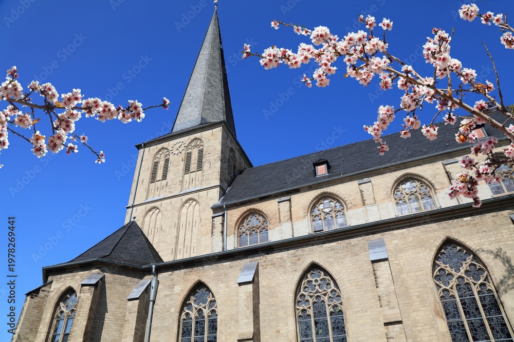 Moenchengladbach Church In Germany Spring Time Cherry Blossoms Wallpaper Mural - Decorly Solutions | Decorly Solutions