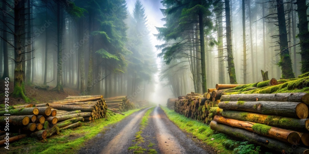 Misty Forest Path Flanked By Stacks Of Harvested Wallpaper Mural - Decorly Solutions | Decorly Solutions