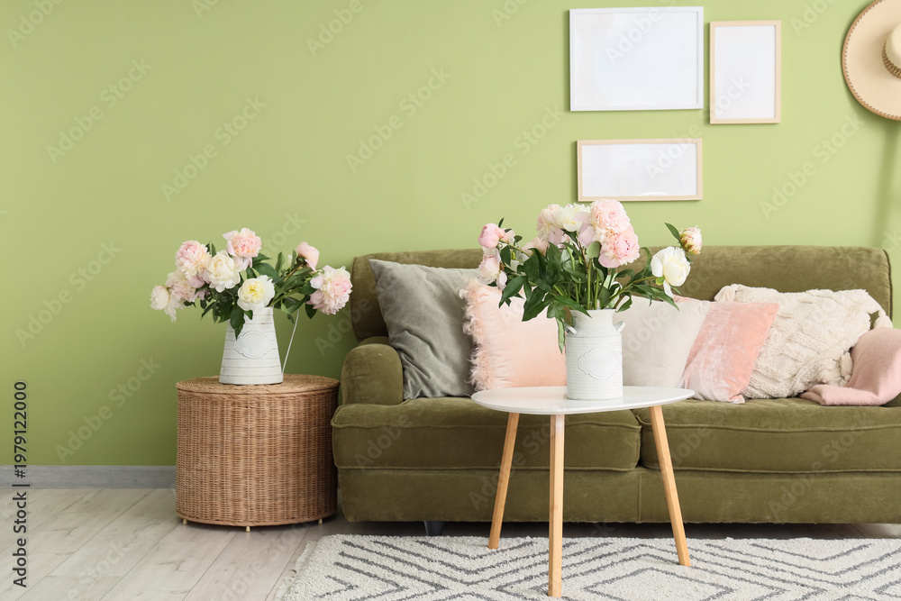 Interior Of Stylish Living Room With Green Sofa Wallpaper Mural - Decorly Solutions | Decorly Solutions