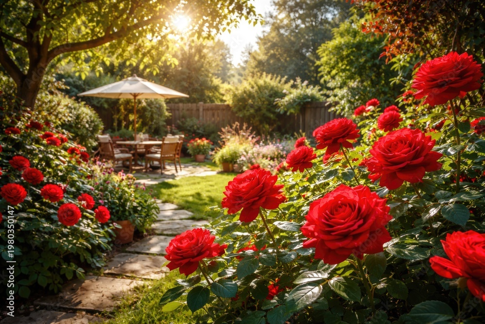 Backyard Blooming With Vibrant Red Roses Under Bright Wallpaper Mural - Decorly Solutions | Decorly Solutions