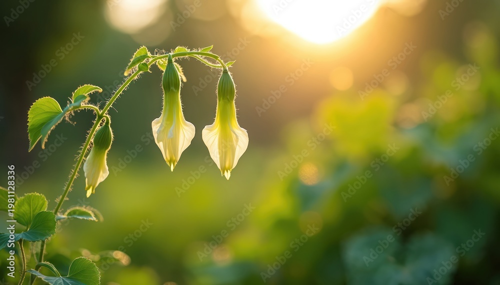 Delicate white morning glory flowers hang from a thin vine S Wallpaper