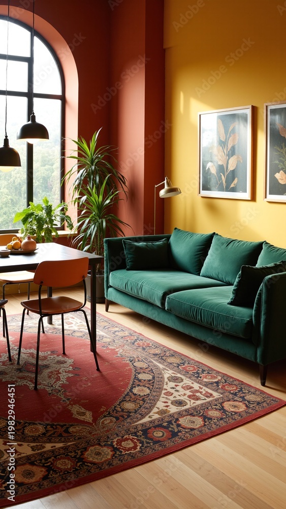 Cozy Green Velvet Couch In A Colorful Sunlit Wallpaper Mural - Decorly Solutions | Decorly Solutions