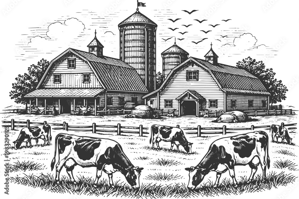 Traditional Dairy Farm Scene – Detailed Black And Wallpaper Mural - Decorly Solutions | Decorly Solutions
