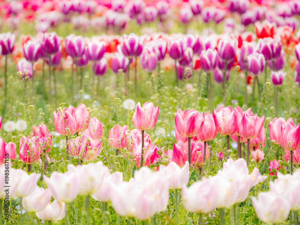 二色のかわいいチューリップ。白、ピンク、紫、赤のカラフルな花。春の公園や花壇を彩る風景。公園のチューリップ畑。自然風景素材 Wallpaper Mural - Decorly Solutions | Decorly Solutions