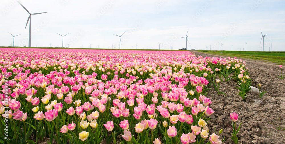 Colorful Flower Field with Wind Turbines under Clear Blue Sky and Bright Cloudscapes