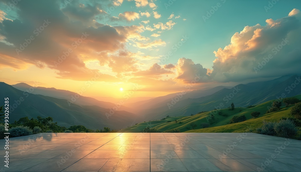 Empty square terrace overlooks green rolling hills with sunl Wallpaper
