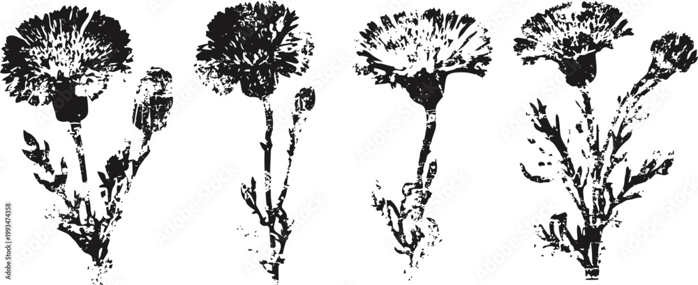 Black and white vintage carnation flowers clipart set with stems and leaves in silhouette
