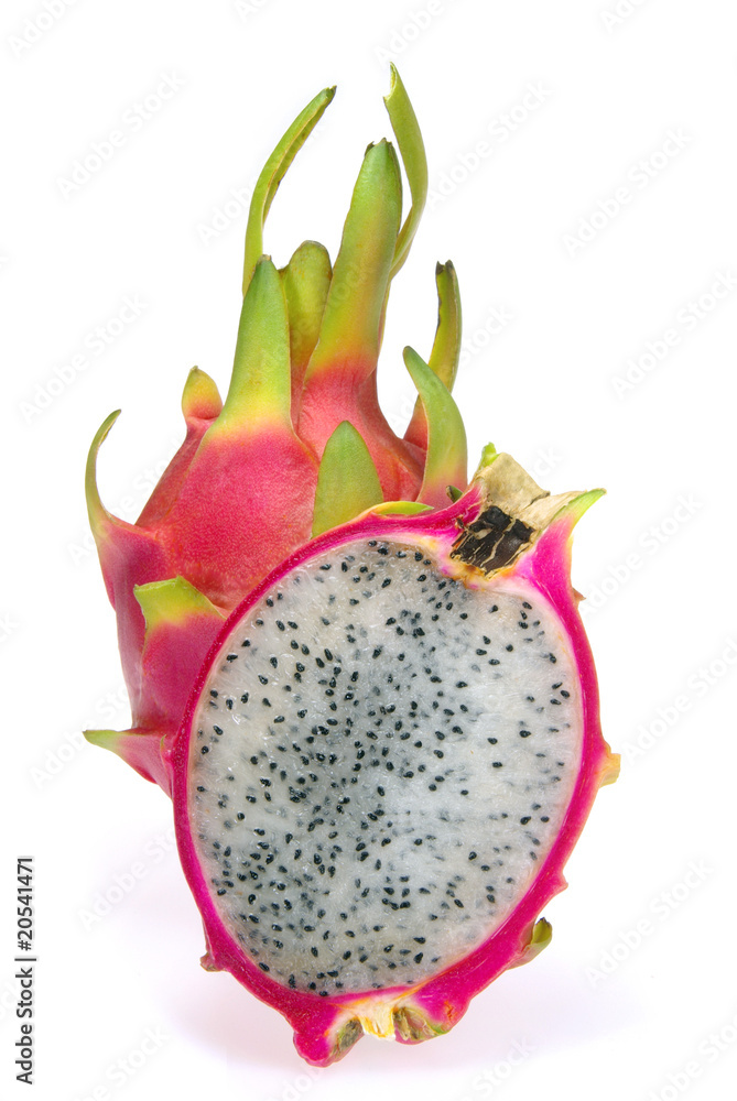 A small piece of a red dragon fruit with black seeds. The fruit is cut in half, revealing the seeds inside
