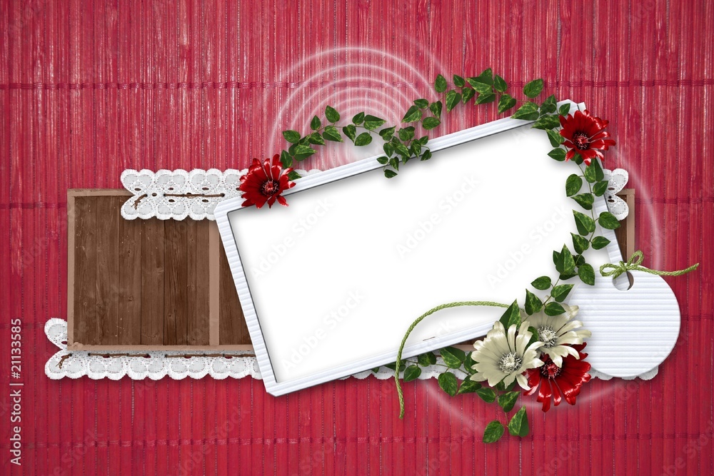 A blank white picture frame with wooden floral patterns centered encircled by lilies and daisies