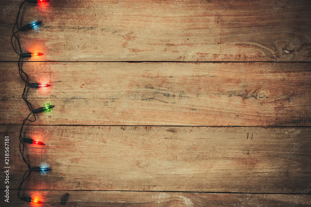 Vintage Christmas lights bulb decoration on old wood plank M Wallpaper
