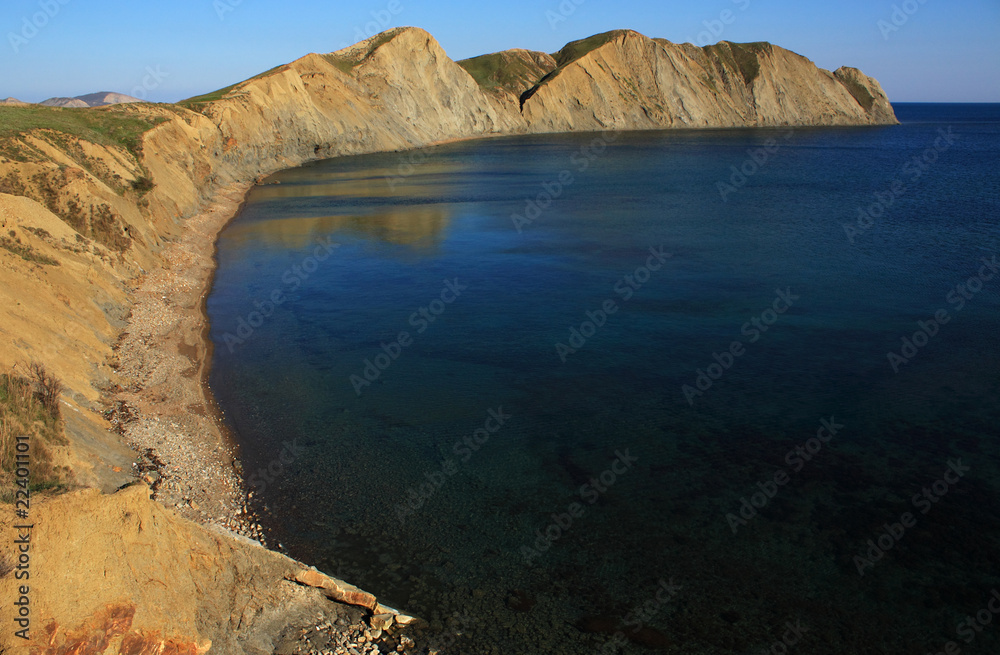 Rocky coastline meeting deep blue sea with boats sailing in crimea, ukraine