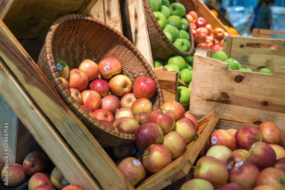 Fresh healthy fruits on shelves in supermarket, with female buyer choosing red apples