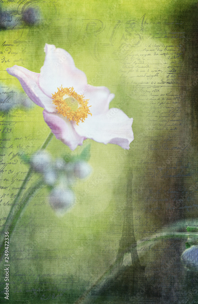 Pink flower blossoming on branch, left, against a soft pastel watercolor backdrop