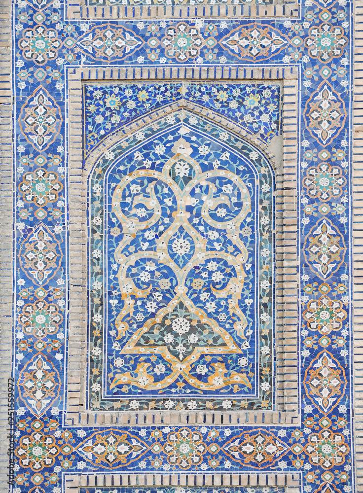 The ceiling is carved with ancient Asian ornament. the details of the architecture of medieval Central Asia
