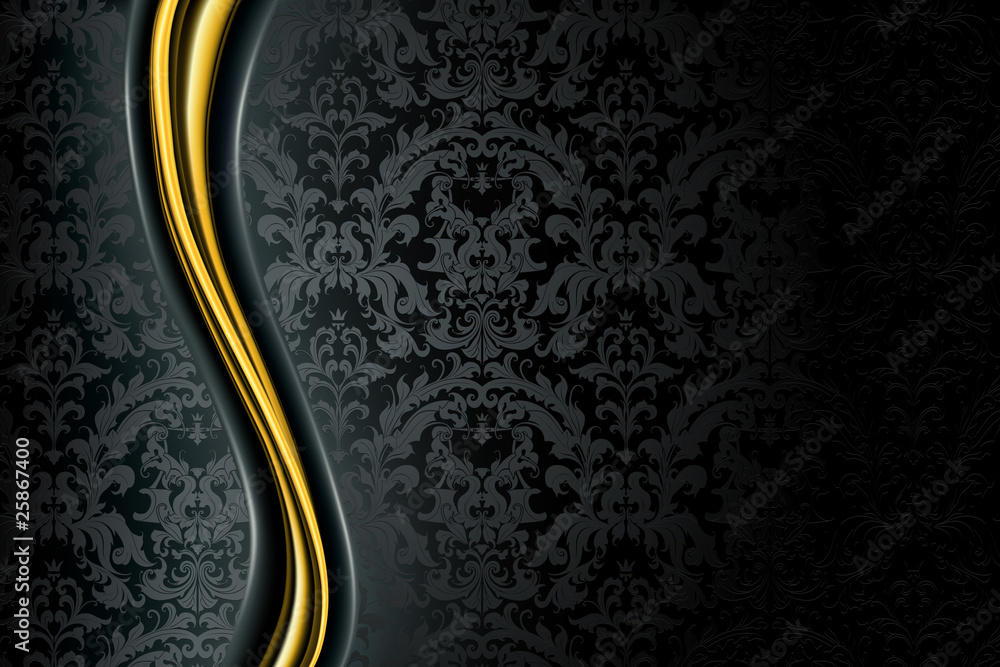 Deep blue textured paper with vignette of golden hand-drawn pattern with golden glittery splatter. Copy space. Digital artwork, A4. (pattern: p10-2c)