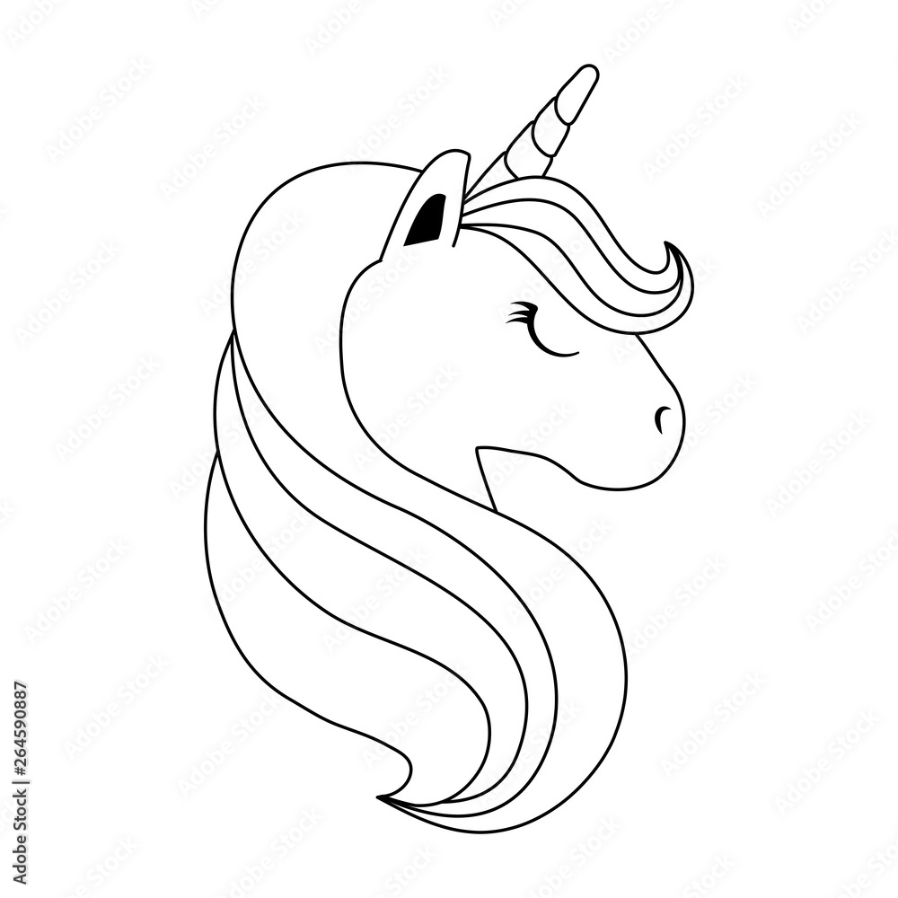 Charming outline of a unicorn head with flowing mane and twinkling stars