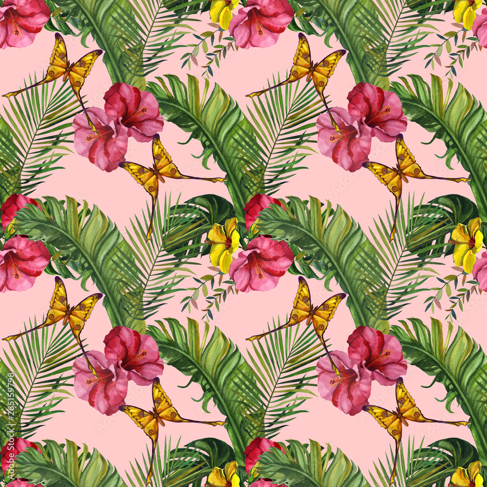 Tropical Foliage and Floral Pattern with Hibiscus Plumeria and Monstera Leaves.