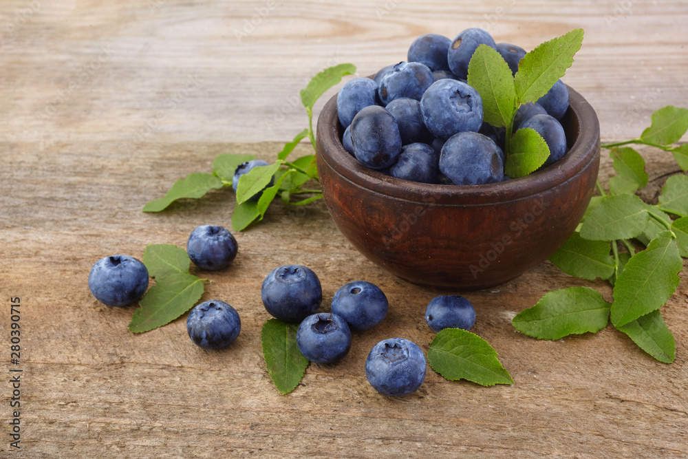 Fresh blueberries in bowl on wooden table