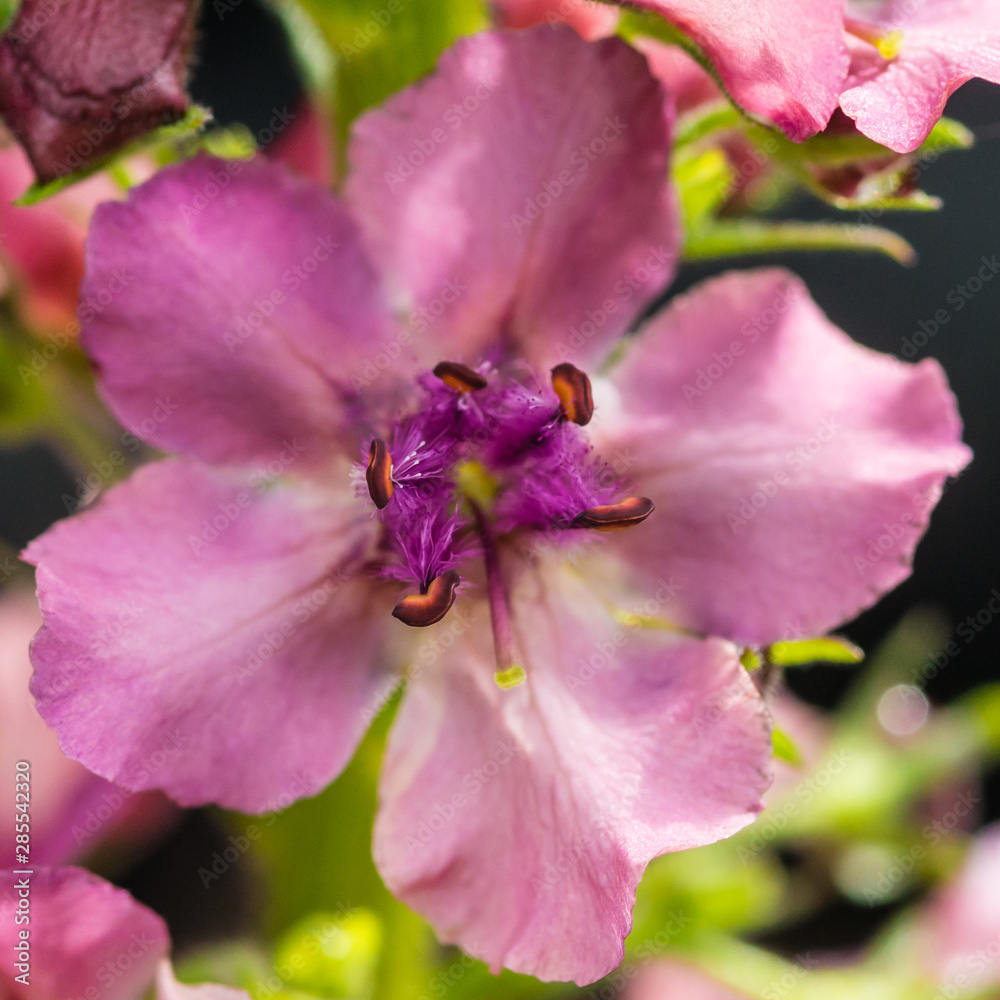 A vibrant close-up of a Melastoma affine flower with delicate purple petals and striking yellow and pink stamens against a lush green background. Ideal for botanical, nature, and garden-themed project