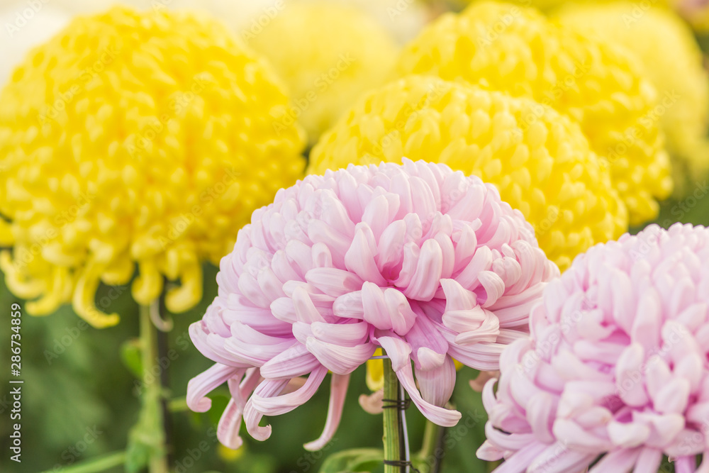 Closeup of pink and white Chrysanthemum flowers with shllow depth of focus