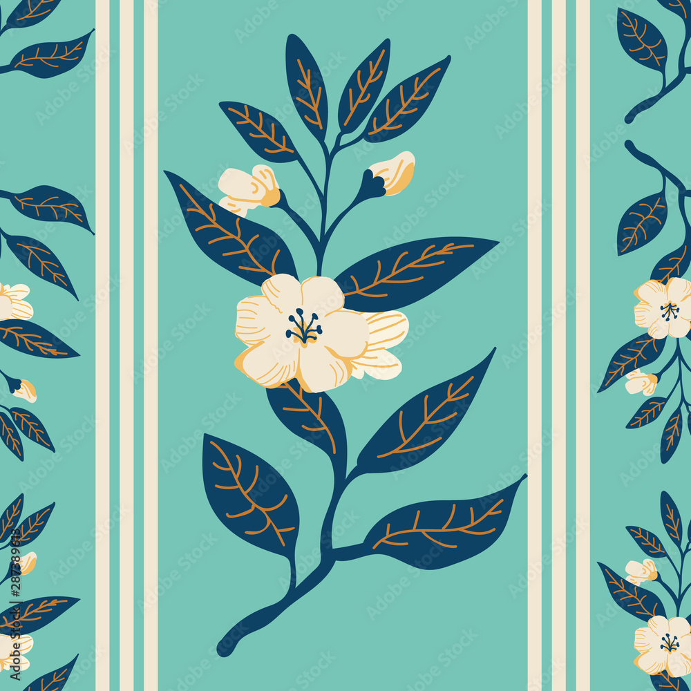 Flower spray stripe seamless pattern in turquoise ecru and d Wallpaper
