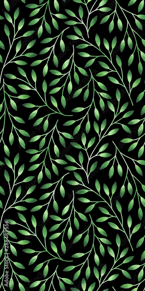 Seamless pattern with stylized leaves. Floral endless pattern filled with green leaves. Fresh greenery background, wallpaper, textile print. Watercolor hand drawn illustration on a dark background.