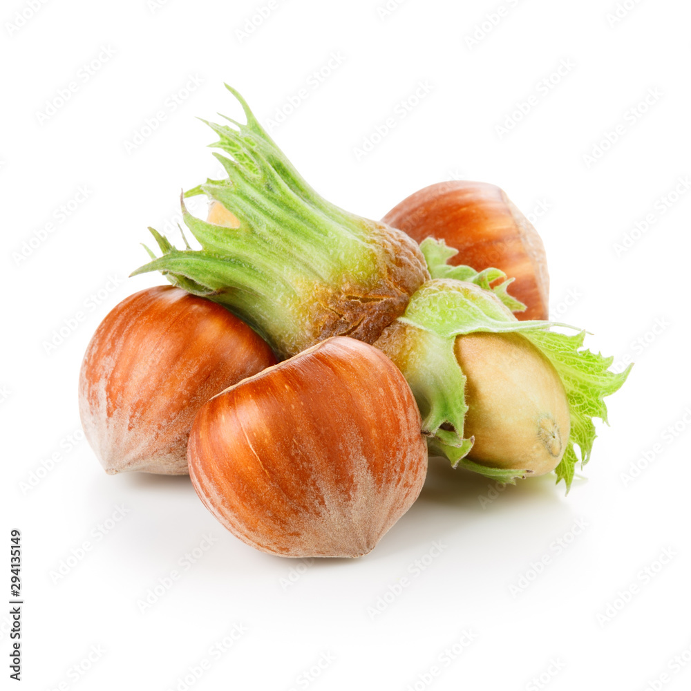 Whole and peeled hazelnut set isolated on white background