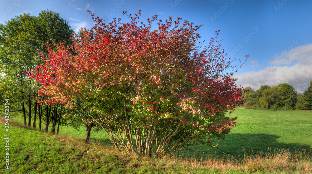 Übersicht über die bunt verfärbten Baumkronen eines Mischwaldes im Herbst bei klarer Sicht und schönem Wetter