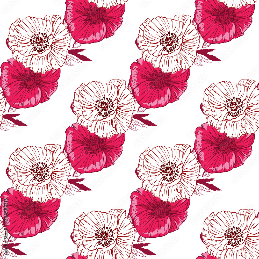 Flourish Poppies Pattern In Line Art Style Poppy Wallpaper Mural - Decorly Solutions | Decorly Solutions