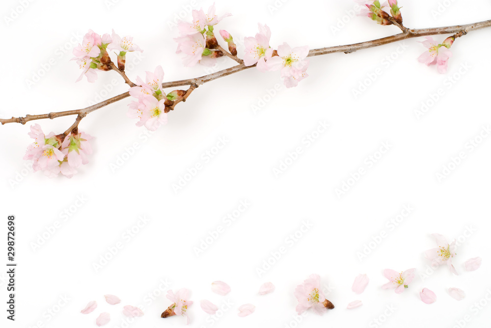 A delicate wedding frame with blooming cherry blossoms in soft pink hues, accented with slender green branches isolated on a white background