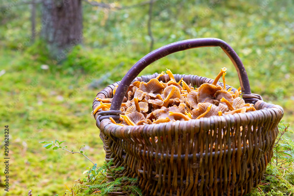 Basket of chanterelles in a Swedish forest after a succeful harvest.
