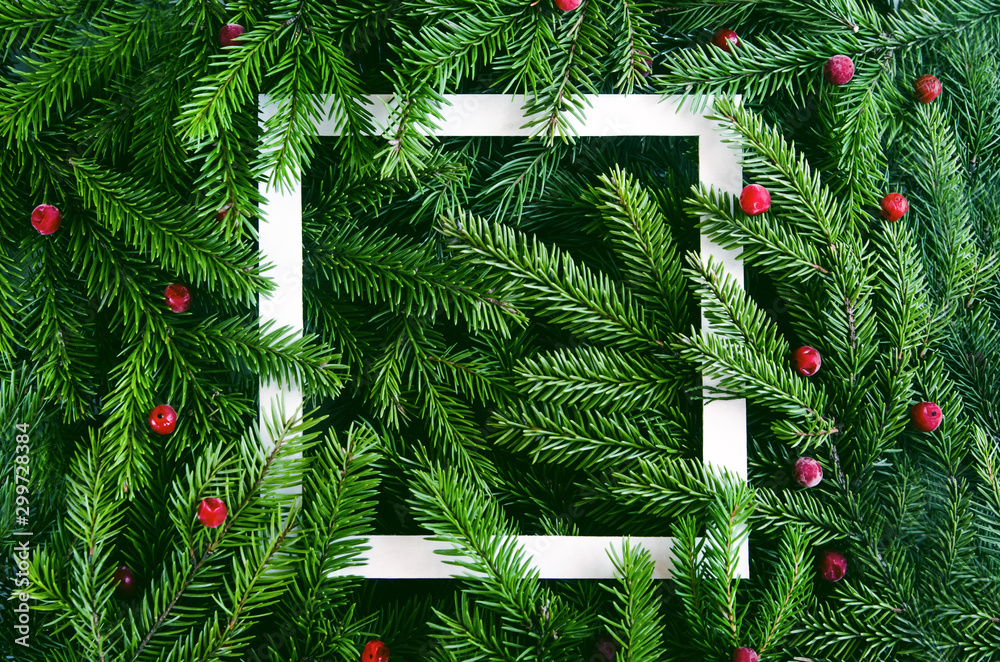 Festive green spruce and fir tree branches border with vibrant red berries framing a white copy space. Christmas and winter holiday decoration background.