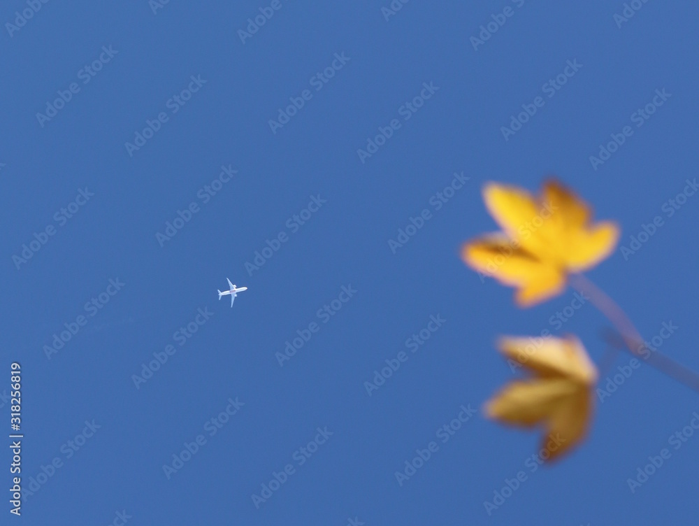 Autumn greeting card with blue background and yellow autumn branches. Copispeses for the inscription. Vibrant fall yellow golden tree foliage on bright blue sky background