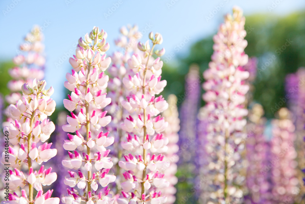 Blossoming Pink Lupin Flowers Against Blue Sky Background Wallpaper Mural - Decorly Solutions | Decorly Solutions
