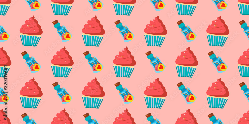 Seamless baby pattern. cupcake cakes and potion bottles. Drink Me. Alice in the Wonderland..