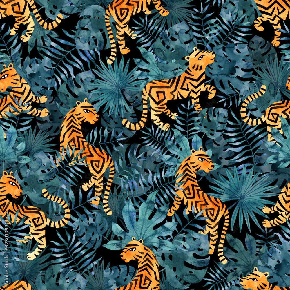 Tropical Watercolor Seamless Pattern With Tigers Hand Painted Wallpaper Mural - Decorly Solutions | Decorly Solutions