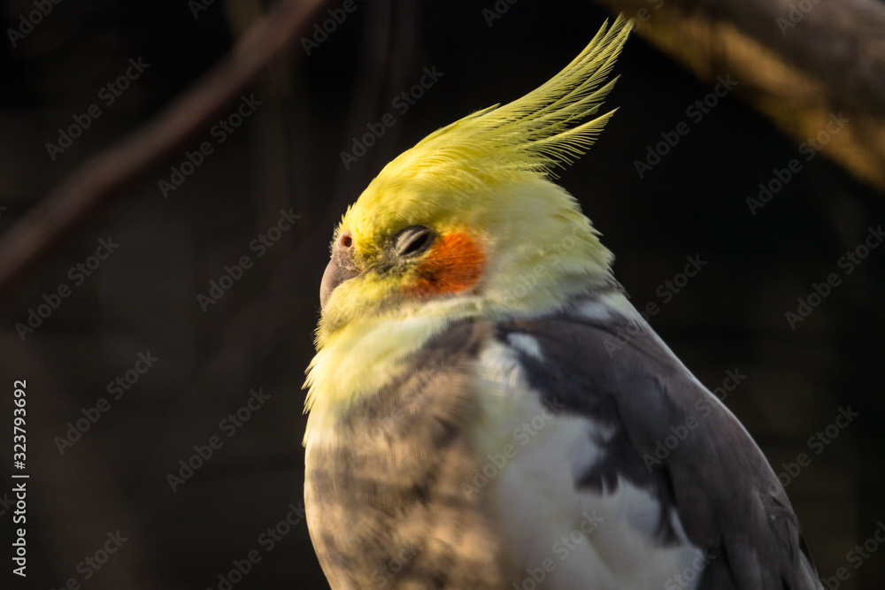 colorful cockatiel portrait on a sunny evening in autumn