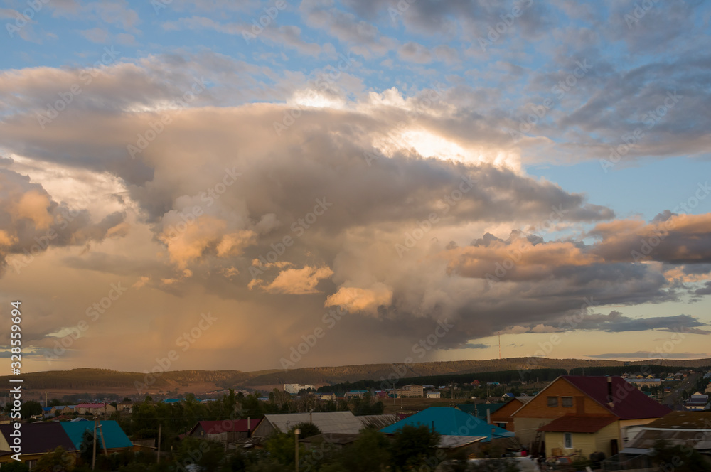 Dark blue grey sky with much rainy clouds before storm.  Background of heaven. Beautiful evening