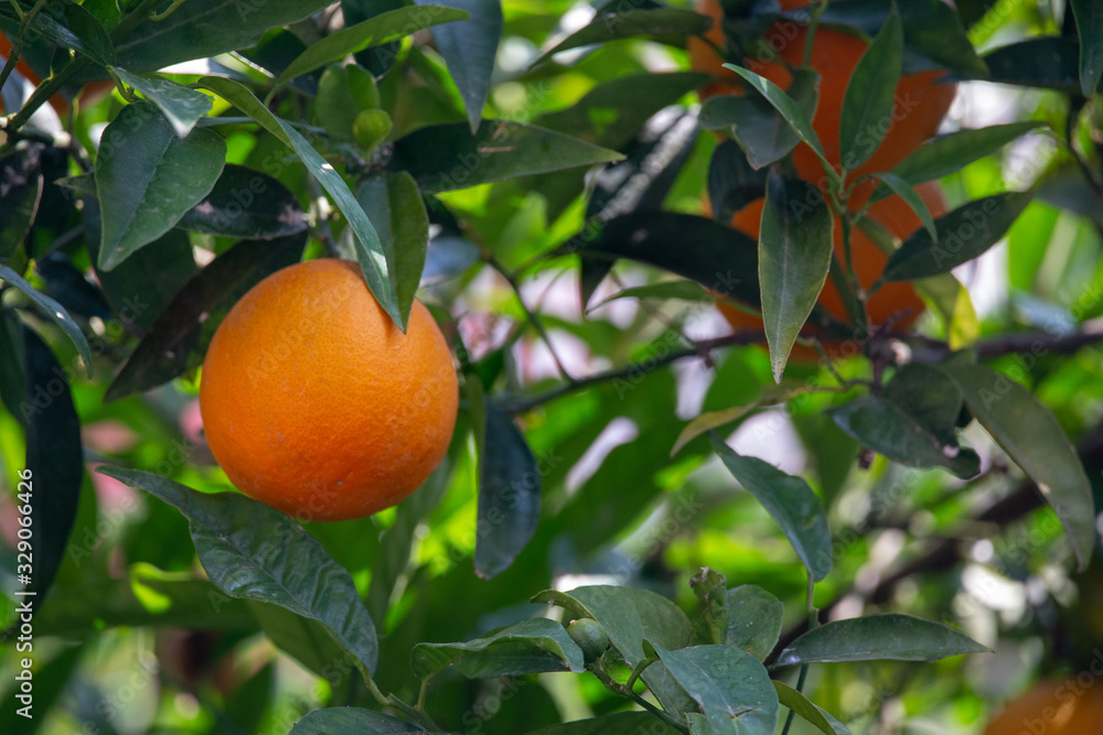 Orange garden with closeup on one orange tree branch during sunny day.