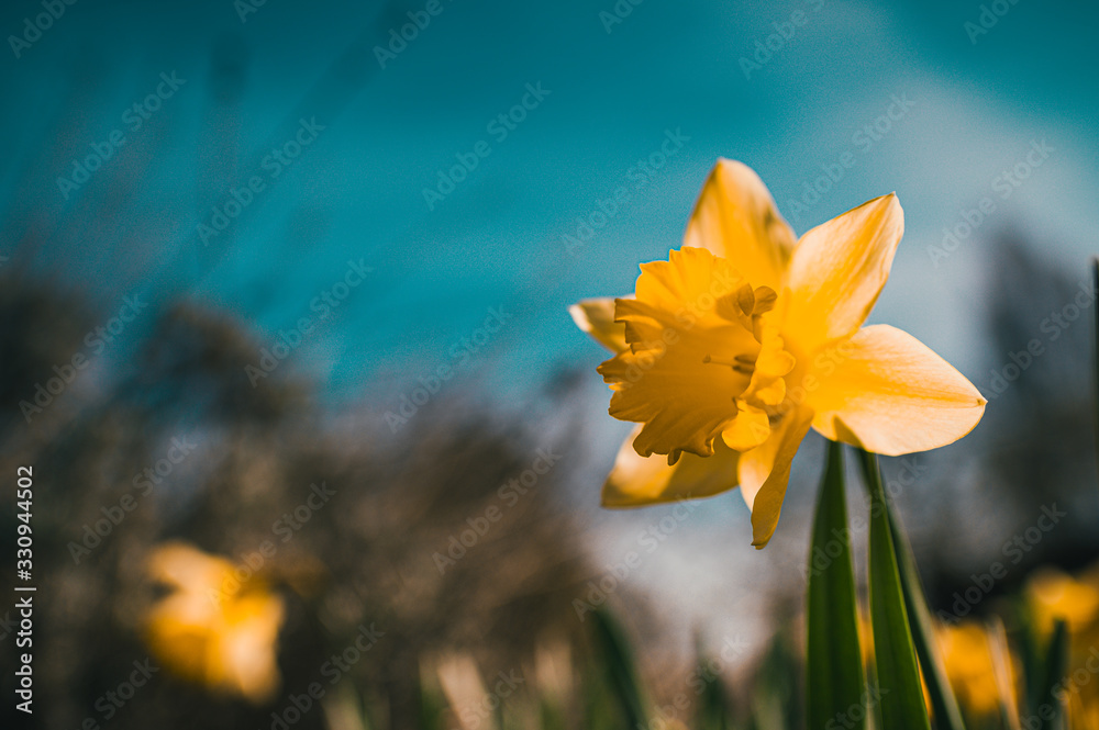 Bright yellow spring flowers of daffodil. Close-up. Selective focus.
