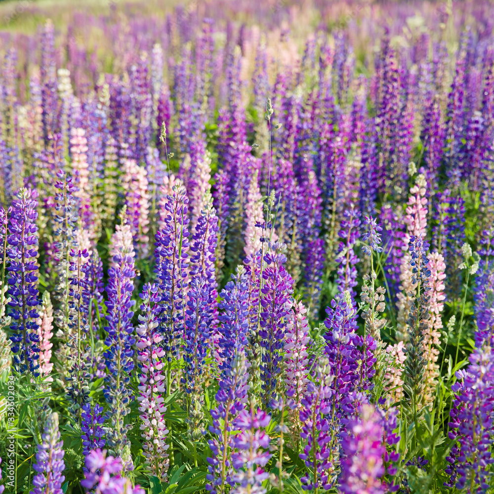Blooming lupine flowers A field of lupines Violet and pink l Wallpaper
