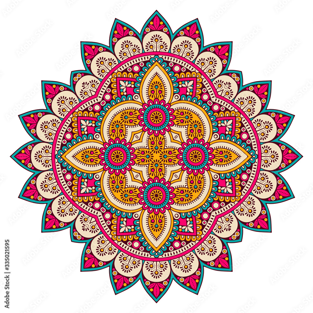 Decorative colorful ethnic mandala pattern. Design element for greeting card, banner or poster in oriental style. Hand drawn illustration
