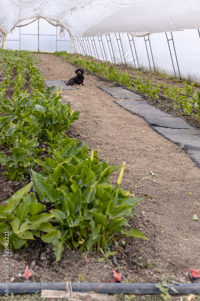 Systematic greenhouse apparatus in a crop production area with lush greenery