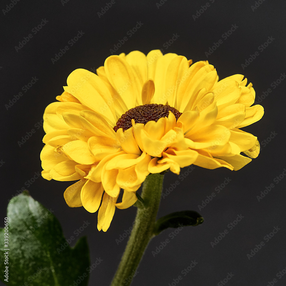 Bright yellow gerbera daisy stands out against a dark background emphasizing the beauty of nature, Bright yellow gerbera daisy against black background