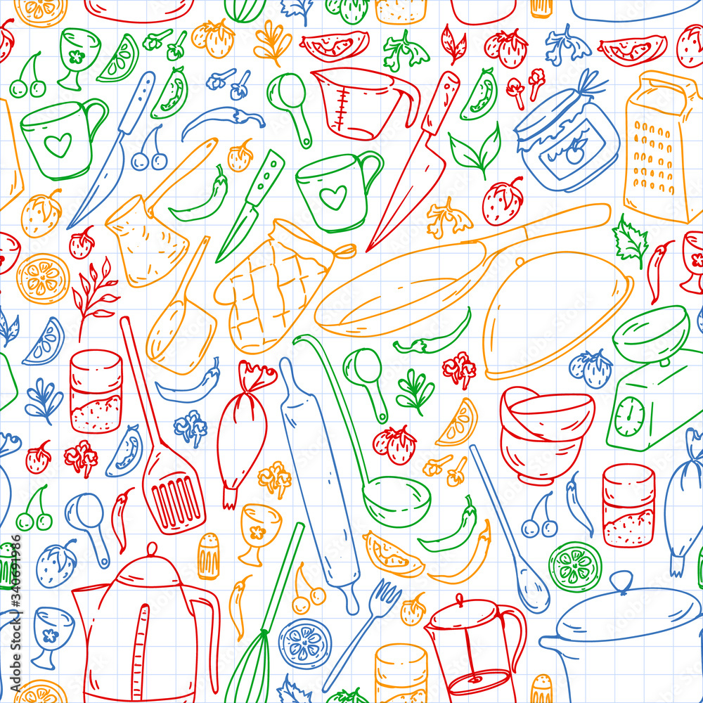 Cooking class. Seamless pattern. Kitchenware, utencils. Food and kitchen icons.