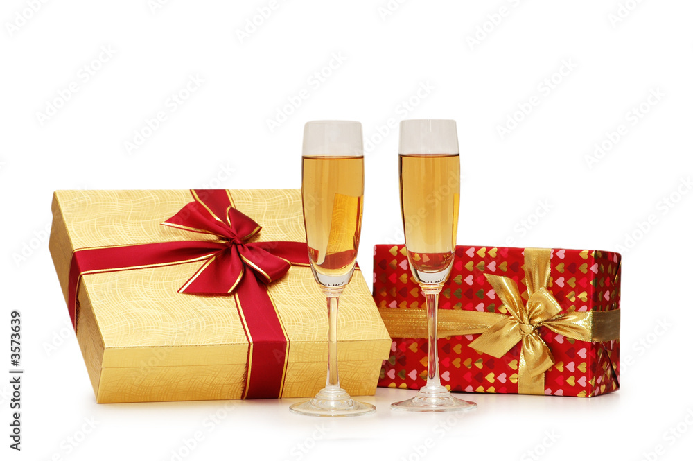 Giftboxes And Champagne Isolated On The White Wallpaper Mural - Decorly Solutions | Decorly Solutions