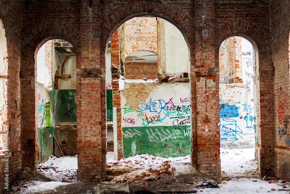 Hooligan smeared paint the walls of the old building. Landscape style. Grungy concrete surface with cracks, scratches and streaks of paint. Great background or texture.